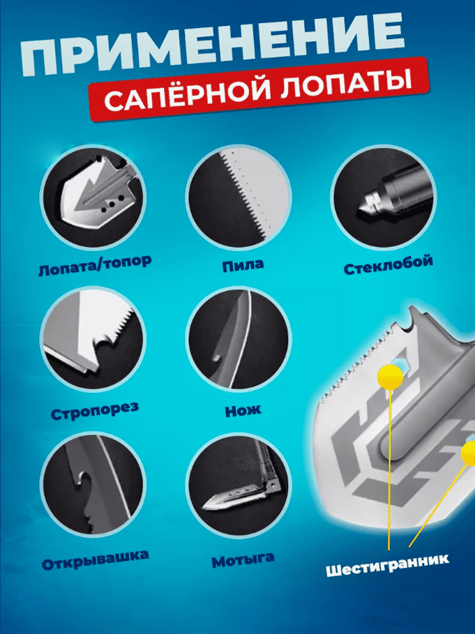 Края инструмента заточены, что даёт возможность использовать её как топорик или нож. Штык имеет 2 рабочих положения: со направленно черенку и под углом 90 градусов. Можно использовать как мотыгу линейку топор пилу кусачки шестигранник нож стеклобой.