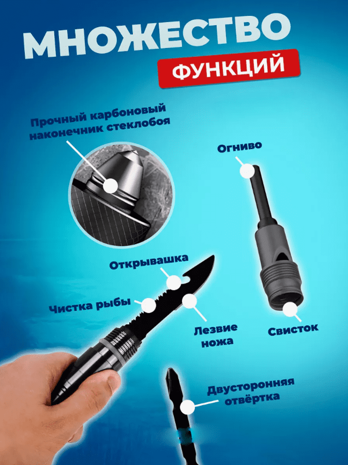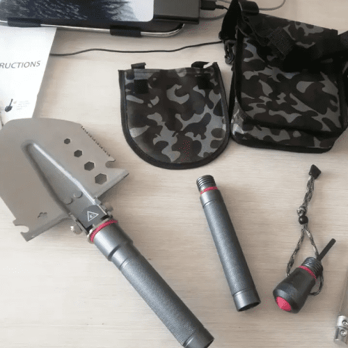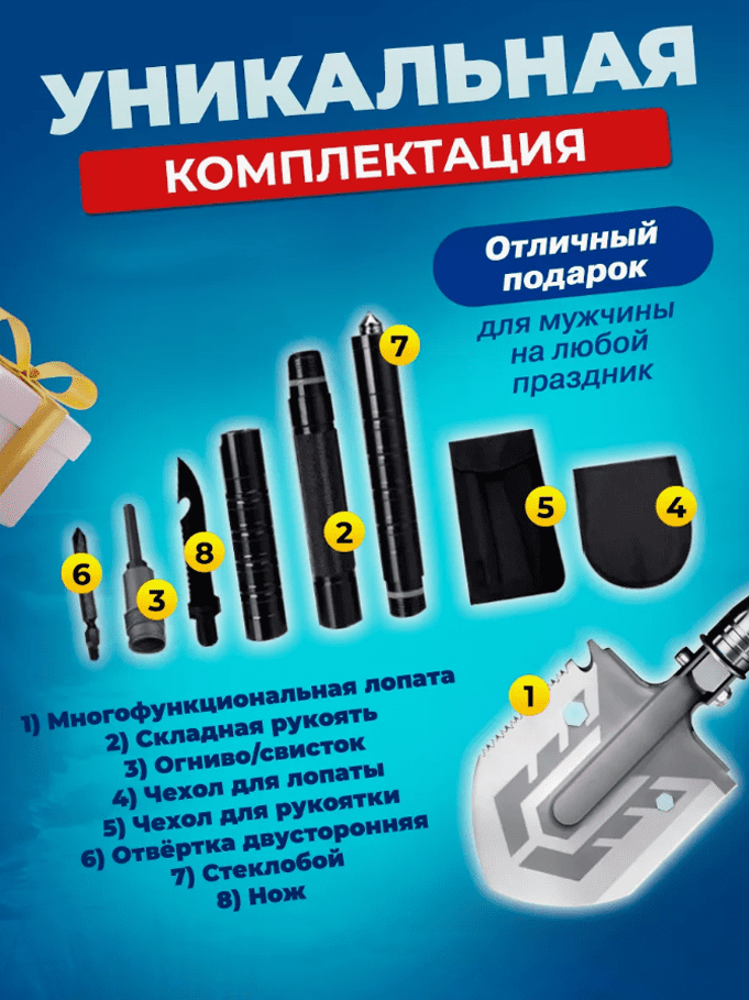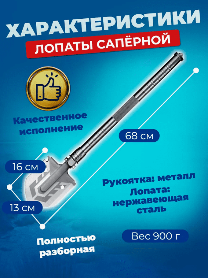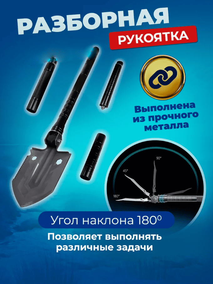 В комплекте лопата, чехол, встроенный нож-пила и подарочный набор налобный фонарь с магнитом. Стоит обратить отдельное внимание на то, что для быстрого использования вам не придётся собирать все удлинители. Достаточно двух простых движений: достал, разложил и пользуйся.